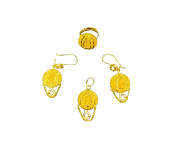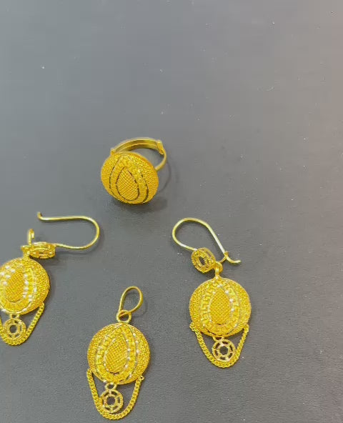 Inspire elegance and luxury with our 21k Bahrani pendant set, weighing at 18.7 grams. Expertly crafted, this set exudes sophistication and adds a touch of glamour to any outfit. Elevate your style and make a statement with this stunning pendant set.