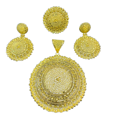 This stunning 21k Bahrani pendant set features an elegant design and is crafted from high-quality materials, weighing 51.1 grams. Perfect for any occasion, this pendant set is a symbol of luxury and sophistication, making it a must-have for anyone looking to make a statement.
