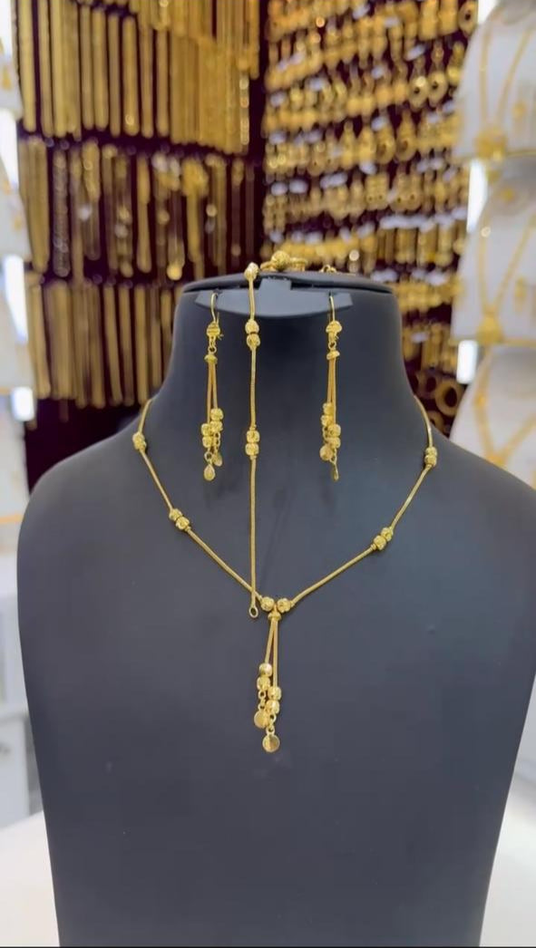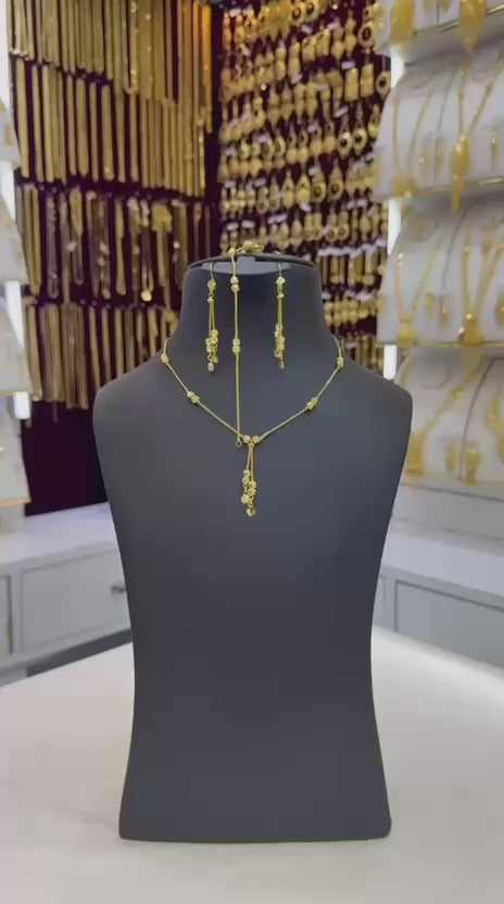 This elegant 21-karat gold jewelry set features a fine, sleek chain design accented with small ornamental beads and a graceful double-drop pendant. The matching long drop earrings mirror the necklace’s delicate beadwork, creating a cohesive and refined look. Perfect for formal gatherings, festive occasions, or as a timeless everyday luxury piece, this set offers a modern twist on classic gold craftsmanship, radiating the rich warmth of 21K gold.