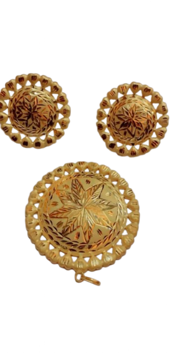 Elevate your jewelry collection with this exquisite 21K gold set, featuring a pair of beautifully crafted round earrings and a matching pendant. Weighing a total of 12 grams, this set showcases a stunning floral starburst design with intricate cutwork edges that reflect timeless craftsmanship.