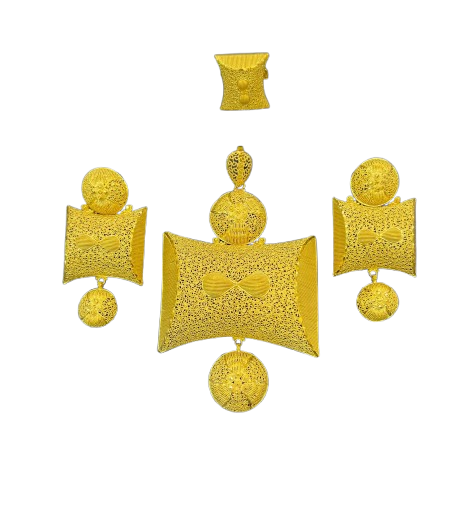 Elevate your jewelry collection with our 21k Indian pendant set! Made with 45.8 grams of 21k gold, this set exudes a luxurious and elegant charm. Perfect for any occasion, this set will surely turn heads and make you stand out in a crowd. Elevate your style today with our 21k Indian pendant set!