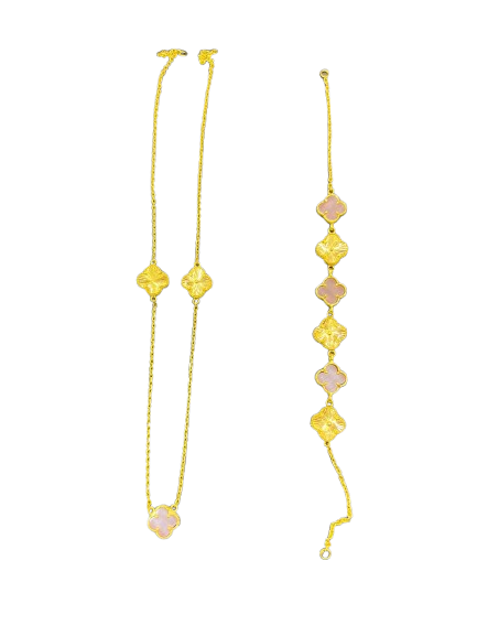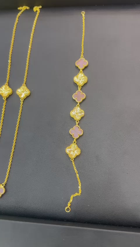 Experience luxury with our 21k- Necklace Bahraini Design 18 Gram! Inspired by Van Cleef, this stunning necklace is crafted with 21k gold and intricately designed for a touch of elegance. Make a statement and elevate any outfit with this unique and timeless piece.