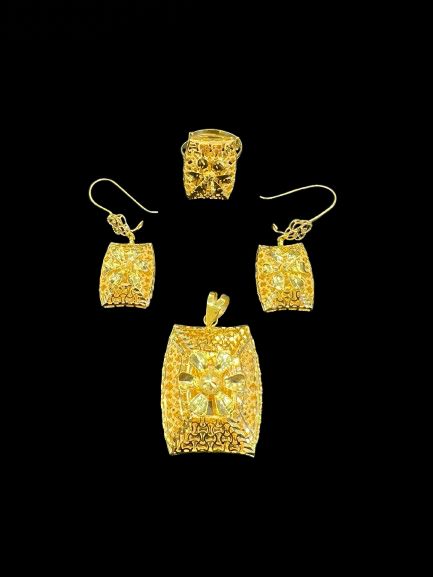 Add a touch of elegance with our 21k- Pendant Set Bahrani 16.9 Gram. Crafted with care, this stunning accessory is perfect for any occasion. Make a statement and stand out with our unique design. Exude confidence and luxury with this beautiful pendant set.
