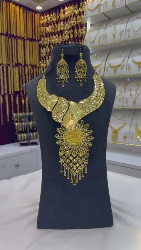 This alluring 21k Turkish Necklace Set will make you stand out with its 96 grams of pure gold. Its intricate design and high-quality craftsmanship will catch everyone's eye and enhance any outfit. Perfect for special occasions or everyday wear. Make a statement with this stunning necklace set!
