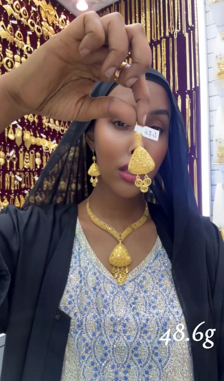 Weighing 48.6 grams, this set is ideal for weddings, cultural occasions, or as a signature heirloom piece. Its intricate goldwork highlights the richness of Middle Eastern design, while the sleek finish gives it universal appeal for today’s modern woman.