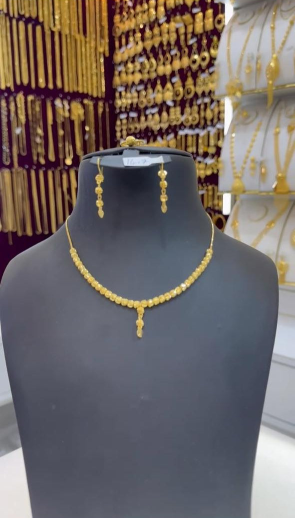 This refined 21-karat gold jewelry set features a beautifully beaded necklace accompanied by matching drop earrings. The necklace showcases a symmetrical arrangement of lustrous gold beads, accented with a graceful central drop pendant. Matching earrings mirror the beadwork, completing the harmonious design. Crafted for weddings, festive occasions, and special celebrations, this set offers a timeless balance of tradition and elegance, with the rich glow of 21K gold enhancing its luxurious appeal.