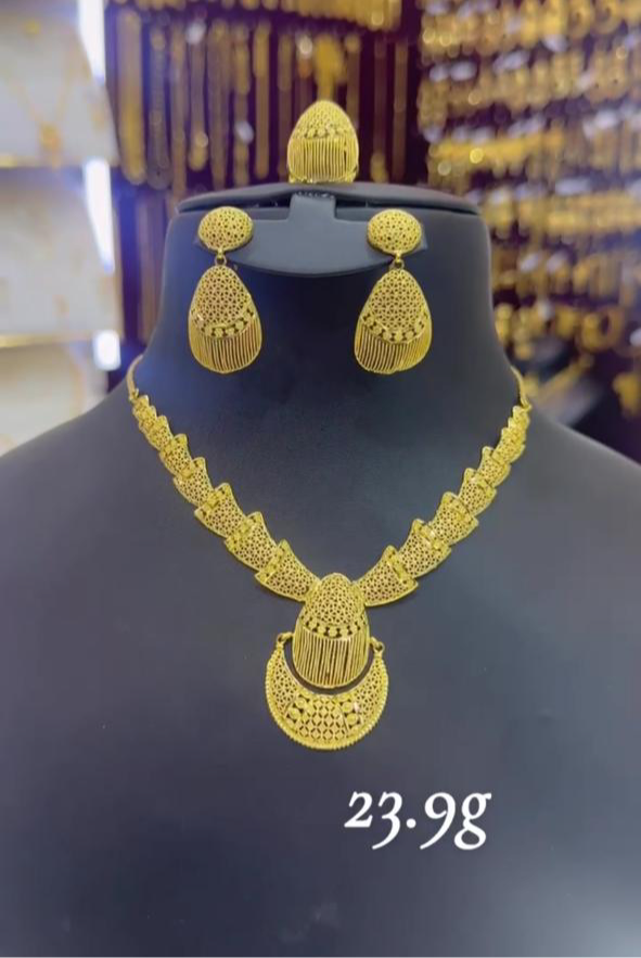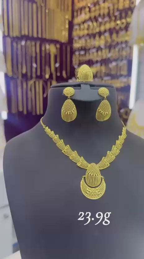This refined 21-karat gold jewelry set weighs 23.9 grams and features a beautifully detailed necklace with a unique teardrop pendant design, adorned with intricate patterns and fine gold fringe accents. The matching teardrop earrings mirror the pendant’s artistry, creating a harmonious and sophisticated look. Perfect for weddings, formal gatherings, and special celebrations, this set showcases the craftsmanship and warm golden luster of premium 21K gold.