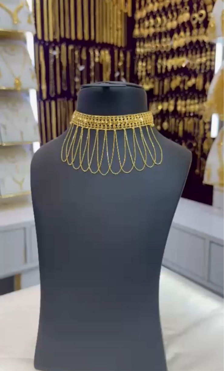 The Emira Choker Set captures the essence of Dubai’s bold elegance — where tradition meets high fashion. Featuring a structured choker with intricate detailing and a radiant finish, this set commands attention while staying effortlessly chic. Paired with matching earrings, it’s perfect for weddings, evening soirées, or modern bridal looks.