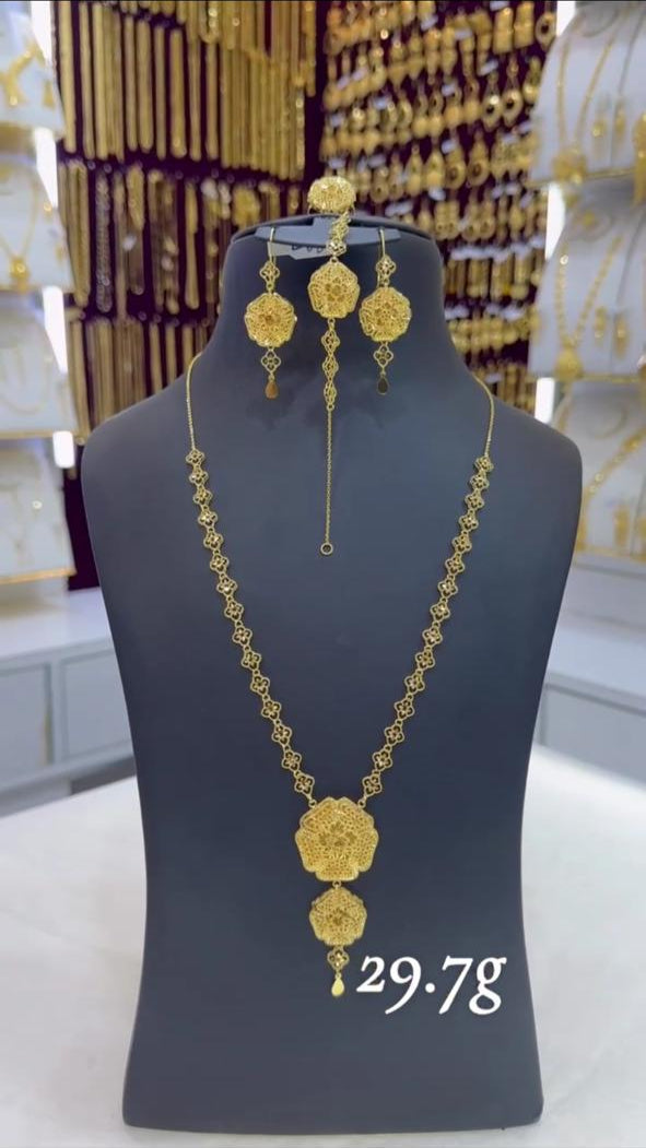 This exquisite 21-karat gold jewelry set weighs 29.7 grams and features a delicately crafted floral filigree design. The necklace showcases an ornate chain pattern leading to a stunning double floral pendant, finished with a teardrop charm for added elegance. Matching floral drop earrings complete the sophisticated look, making this set perfect for weddings, festive occasions, and cultural celebrations. The fine craftsmanship and warm glow of 21K gold make it a timeless statement piece.