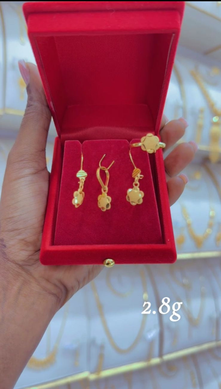 Delicate and charming, the Golden Bloom Dubai Set is crafted in 21K gold with a total weight of 2.8 grams. The set features a floral-inspired design with a pendant, matching earrings, and a ring, making it a perfect everyday accessory or a thoughtful gift.