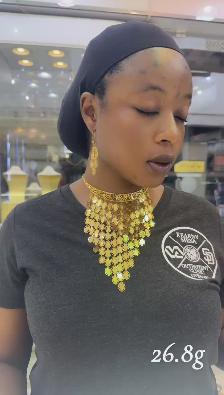 Radiate grace and power with Melek, a breathtaking 21K Turkish gold choker weighing 26.8 grams. Inspired by Ottoman artistry and crafted with Dubai’s world-renowned precision, this statement piece sits elegantly at the neckline, blending timeless tradition with modern luxury