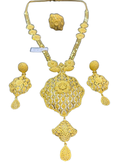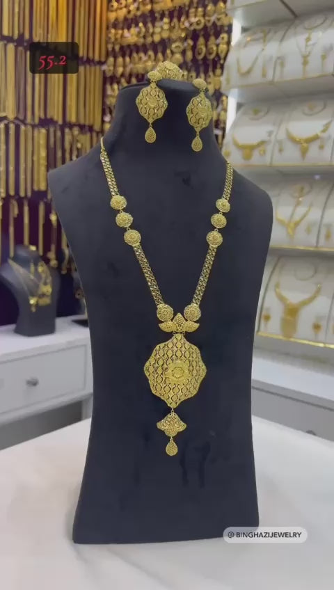 Illuminate any occasion with the majestic Noor-e-Zar Necklace Set. Weighing 55.2 grams, this set exudes luxury and sophistication. Its intricate design and exquisite craftsmanship make it a true masterpiece. Elevate your style and make a statement with this exclusive necklace set.