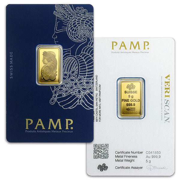 Expertly crafted by PAMP, the SUSIE GOLD BAR offers 5 grams of pure gold. With PAMP's renowned quality and precision, this gold bar is a solid investment for any portfolio. Add a touch of luxury and security to your assets with this 99.99% pure gold bar.