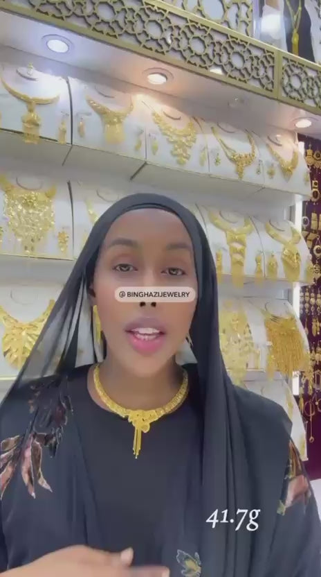 Crafted in pure tradition and elegance, the Rajni Necklace Set weighs 41.7 grams of stunning craftsmanship. Designed with intricate Indian motifs and finished in radiant gold, this set includes a statement necklace and matching earrings — ideal for weddings, festivities, or heirloom gifting.