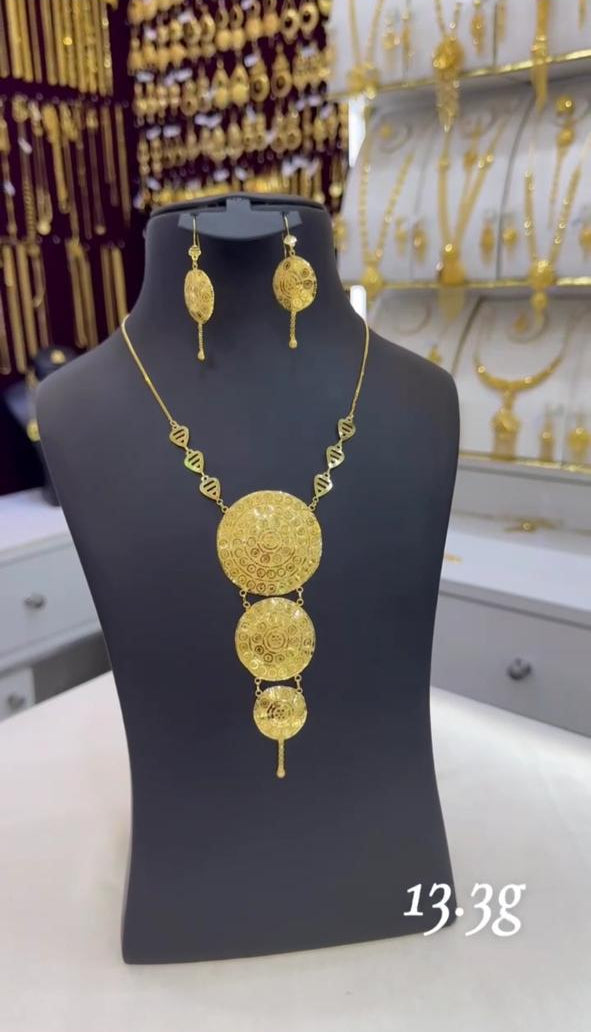 This refined 21-karat gold jewelry set weighs 13.3 grams and features a necklace adorned with three intricately patterned medallions in a cascading arrangement. The delicate chain is enhanced with geometric gold accents, adding a touch of artistry to the design. Matching medallion drop earrings complete the look, making this set perfect for special occasions or as a graceful everyday accessory, all while showcasing the timeless brilliance of 21K gold.